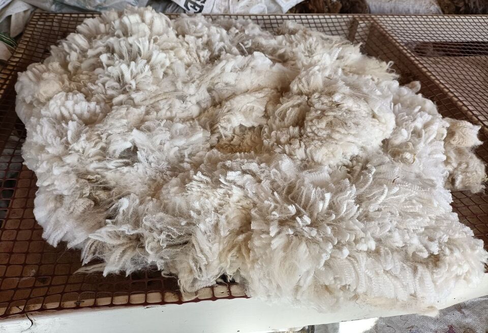 1st Fleece from Hannah, a lovely white girl. Fleece weight 1.19kg and 14.8 micron. Staple length 125mm. This is a very lustrous fleece with beautiful crimp on the staples. As this has not been skirted it will have some VM (vegetable matter)
