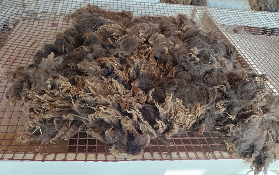 1st Fleece from Warrior Queen, a lovely dark brown girl. Fleece weight 694g and 19.7 micron. Staple length 130mm. As with all dark cria fleeces the tips are stained from the amniotic fluid when she was still in uterus.